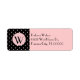 Élégantes étiquettes d'adresse de retour faites en rose pâle, avec du texte personnalisé noir. Un noir avec petit motif à pois rose orne le côté gauche du étiquette, avec un disque rond rose et un monogramme noir d'une lettre. Personnalisez tout le texte de ce étiquette de adresse à la mode, idéal pour un usage personnel ou professionnel.