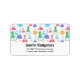 Étiquette de adresse avec un motif amusant et coloré. Un scientifique de recherche vibe avec des beakers et des flacons de différentes formes et tailles dans des couleurs vives et joyeuses.