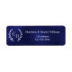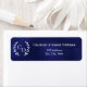 A navy blue uneven colored background. Decorated with a white wreath. Personalize and add your names, address and your first name initials. White text.