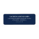 Cette étiquette d'adresse de retour présente un design sophistiqué et minimaliste avec un fond bleu marine profond et un texte blanc net. La mise en page est propre et organisée, utilisant un espacement généreux pour mettre en valeur la typographie serif élégante qui transmet la formalité et le raffinement. Parfaite pour les occasions formelles, cette étiquette combine simplicité et sophistication, ce qui la rend idéale pour les mariages ou autres événements spéciaux où la clarté et l'élégance sont essentielles.