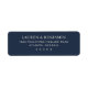 Cette étiquette d'adresse de retour présente un design épuré et élégant avec un fond bleu marine foncé uni et un texte blanc net. La mise en page est minimaliste, mettant en valeur un arrangement centré de texte de remplacement personnalisable dans une police serif classique qui transmet la sophistication et l'intemporalité. Un espace négatif généreux améliore la lisibilité et ajoute à l'esthétique raffinée, ce qui la rend parfaite pour les invitations ou les annonces formelles. L'ambiance générale est sophistiquée et discrète, idéale pour ceux qui recherchent une présentation élégante mais simple.