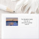 Cette étiquette d'adresse de retour de Noël présente le Père Noël volant au-dessus de Santorin, Grèce.