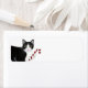 Le chat kitty noir et blanc tient un sucre de canne rayé de Noël en étonnement parce qu'il voulait vraiment attraper photo de retour de Noël étiquette d'adresse