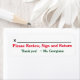 Cette conception étiquette comprend la demande "Veuillez revoir, signer et retourner", ainsi qu'une ligne de signature et le nom d'un enseignant personnalisé. Il pourrait être utilisé par un enseignant, par exemple, pour demander à un parent ou à un tuteur d'examiner et de reconnaître la marque reçue par un enfant lors d'une affectation.