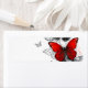 Un troupeau de papillons de morpho volants, réalistes, rouges et noirs sur un arrière - plan blanc avec des gouttes de peinture.