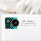 Conception mignonne avec motif vintage noir damassé avec effet turquoise IMPRIMÉ ou bleu aqua parties scintillant et initiale monogramme. Utilisez ce plaisir Retourner les étiquettes d'adresse avec votre initiale monogramme, nom et adresse pour vos invitations de mariage, mariage vous remercier cartes ou invitations de douche nuptiale et plus encore. Pour d'autres couleurs de parties scintillant, contactez le propriétaire du magasin. Copyright Elke Clarke.