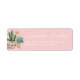 This return address features painted artwork of desert cactus in Mexican pots on a pink background with white text. Colors include green, pink, yellow, blue white and coral.