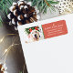 Étiquette de adresse moderne avec votre photo préférée de votre bébé en fourrure, "Happy Pawlidays", nom de famille dans serif moderne en lettrage sur l'arrière - plan rouge festif.