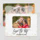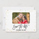 Carte de mise en page "Save The Date" avec photo et écriture manuscrite Sparkle Gold. Elle comporte un espace pour une photo avec un cadre à coins arrondis dégradés, des étoiles dorées fausses autour des bords, un script manuscrit "save the date" sur fond blanc. Au verso, votre photo derrière une forme semi-transparente (pour un aspect délavé), qui fait place au texte. Utilisez l'outil Personnaliser pour ajouter vos informations, remplacer cette photo. Pour des idées assorties, veuillez visiter ma collection de cartes "Save The Date" avec photo.