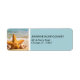 Étiquettes de adresse avec une photo mignonne d'une étoile de mer placée debout dans le sable. Sous ses bras se trouvent 2 petits coquillages reposant confortablement. Installé sur une plage aux vagues qui s'écrasent dans l'arrière - plan.