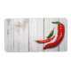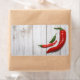 Corner border of red and green hot chili peppers organically grown on a white washed wooden background