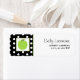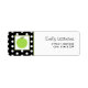Étiquettes de adresse illustrant une pomme verte à l'intérieur d'un cadre blanc avec garniture verte à gauche. Arrière - plan noir avec pois blancs et garniture verte. Personnalisez le bon côté avec votre nom et votre adresse. Recherchez des articles de papeterie, des cartes et plus encore chez Jill's Paperie.