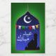 Illustration de l'Aïd Moubarak avec une scène nocturne festive : une guirlande colorée, la lune et les étoiles et une silhouette d'une mosquée exposée dans une fenêtre arabe sur un arrière - plan à motifs verts.