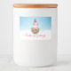 Étiquettes de contenants alimentaires au design mignon et fantaisiste avec un adorable pingouin portant un chapeau de santa rouge. Derrière un bouquet de fleurs aux sucres de canne rayés roses et blancs. Un arrière - plan d'hiver enneigé avec des flocons de neige tombant.