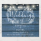 Doté de jolies lampes à cordes, cet élégant design de mariage peut être personnalisé avec vos informations en lettrage élégant sur un arrière - plan de panneaux de bois bleu rustique. Conçu par Thisisnotme©