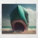 Sculpture de requin sur la plage, dans le style rendu en cinema4d, grotesque surréaliste, illustration onirique, cyan foncé et vert, concept art, échelle gigantesque, objectif fisheye