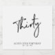 Cette étiquette de bouteille moderne est parfaite pour une fête chic d'anniversaire de 30 ans. Le design présente un lettrage noir " Trente " avec un texte personnalisé. Vous pouvez personnaliser le texte et la couleur de fond. Les invitations et les fournitures de fête assorties sont disponibles dans ma boutique BaraBomDesign. Merci !