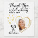 Créez des étiquettes de bouteilles de vin blanc, noir et or Merci pour la fête du 50ème anniversaire avec un design élégant qui comprend une photo en forme de coeur, le nom, et le cinquantième jalon. Utilisez le modèle pour taper votre prénom et votre nom et ajouter une photo. Les prénoms et les noms de famille sont changés dans des champs séparés pour les placer élégamment le long du coeur. Vous pouvez également changer le jalon en 30ème, 40ème, 60ème, 70ème, 80ème, etc.