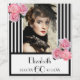 Pour une soirée de 60e anniversaire élégante et amusante. Classic mince bandes verticales noir et blanc comme arrière - plan. Avec fleurs girly et féminine, roses roses roses et pivoines comme décoration. Un cadre sur le devant avec modèle pour l'âge de 60 ans, un nom et des dates. Modèle pour votre propre photo verticale.