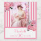 Un étiquette pour une amusante fête du 90e anniversaire. Classic rose mince et blanc rayures verticales comme arrière - plan. Avec fleurs girly et féminine, roses roses roses et pivoines comme décoration. Un cadre sur le devant avec modèle pour 90 ans, nom et dates. Modèle pour votre propre photo verticale.
