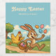 Cette illustration de Pâques ludique présente un lapin excentrique qui s'enfuit joyeusement avec un panier rempli d'oeufs colorés de Pâques, tandis qu'un poulet surpris poursuit après lui ! Situé dans un paysage printanier lumineux et joyeux, dessiné dans un style de dessin animé rétro, ce design apporte un sourire aux petits comme aux grands. Un design humoristique et léger pour une joyeuse fête de Pâques !