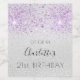 Pour une fête d'anniversaire de 21ème anniversaire (ou de n'importe quel âge) avec les filles. Un arrière - plan métallique à l'aspect faux argent avec de la poussière de parties scintillant violet. Le texte : Le nom est écrit en noir avec un script de style à la main moderne. Personnalisez et ajoutez un nom, 21 ans et une date. Date de naissance ou date de la fête.