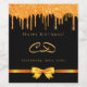 Faux ruban or et arc de couleur or avec des gouttes de glitter faux or, la peinture goutte à goutte. Un arrière - plan noir chic. Personnalisez et ajoutez votre monogramme, vos initiales et une date. Avec le texte. Joyeux anniversaire. Lettres de couleur dorée.