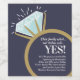 Étiquettes de bague de fiançailles en or et diamant et fait amusant moderne bleu foncé. Elle a dit oui étiquettes de vin de soirée de fiançailles personnalisez avec votre propre nom et faits amusants de couples, idéal pour les faveurs ou à placer sur vos tables d'événement. D'autres articles assortis également disponibles. © Conception de bague graphique originale par www.mylittleeden.com et www.mylittleedenweddings.com sur zazzle.