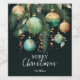 Étiquettes élégantes pour bouteilles de vin pour la fête de Noël avec branches de pin, ornements de boule de Noël verte et or et rubans sur fond noir avec vos détails en lettrage chic, parfait pour votre rassemblement festif de vacances ou pour vos cadeaux.
