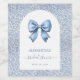 An arched blue and white design, for a coquette bridal shower with "something blue", that combines the old and the new: a modern arch with a blue bow on top, on a vintage blue and white floral pattern that resembles French toile de Jouy or chinoiserie. The occasion is written in script. The text is blue, inside the white arch. In the upper part of the arch, above the text, there is a blue bow in watercolor.