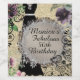 Une robe noire chic sur fond d'or avec des fleurs violettes et des tourbillons décoratifs avec un cercle argenté avec de l'argent fleurit où vous pouvez customiser votre événement. Vibes élégantes pour filles glam.