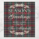 This elegant and contemporary wine bottle label features a plaid pattern with the classic "Season's Greetings" message. It showcases shades of green, dark blue, and red, evoking a classy and nostalgic English holiday ambiance. You can personalize it with your own family name or text. This label is ideal for decorating Christmas gifts in a classic colonial style, as well as for a charming country cottage or log cabin theme.