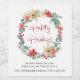 Étiquette de vin de Noël d'entreprise pour les événements de fêtes de votre entreprise ou pour les cadeaux à vos clients avec une couronne aquarelle de fleurs de poinsettia rouges et blanches, d'eucalyptus et de verdure saisonnière. "Joyeuses Fêtes" est écrit en rouge contemporain et vous pouvez personnaliser une bonne année ou un autre message et le nom de votre entreprise en dessous en typographie moderne simple.