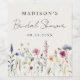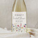 Élégantes étiquettes de vin pour baby shower mariage floral élégant avec une bordure inférieure de fleurs sauvages aquarelles et feuillage dans des tons de rose, jaune, violet, bleu et vert sur fond crème. Personnalisez les étiquettes de vin de mariage champêtre avec le nom de la future mariée et la date. Les étiquettes de vin personnalisées avec des fleurs sauvages sont parfaites pour les baby showers de mariage de printemps et d'été.
