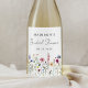Élégantes étiquettes de vin pour fête de mariage floral avec une bordure inférieure de fleurs sauvages aquarelles et feuillage dans des tons de rose, jaune, violet, bleu et vert sur fond blanc. Personnalisez les étiquettes de vin de mariage champêtre avec le nom de la future mariée et la date. Les étiquettes de vin personnalisées sont parfaites pour les fêtes de mariage de printemps et d'été.