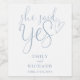Cet élégant script bleu poussiéreux "Elle a dit oui" boisson de la fête de fiançailles étiquette peut être personnalisé avec tous vos noms et date spéciale. Conçu par Thisisnotme©