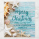 Des étiquettes de vin de vacances d'entreprise de plage personnalisées mignonnes pour une entreprise d'île tropicale. Personnalisez ces jolies étiquettes de cadeau de Noël en bois et coquillages de couleur bleu sarcelle avec le nom de votre société côtière ou autre texte professionnel côtier.