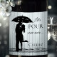 Étiquette à vin avec une silhouette d'un couple avec des coeurs pluvieux sur un arrière - plan rayé avec dentelle et avec vos propres textes drôles. Belle pour la Saint Valentin ou une occasion romantique.
