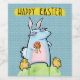Un lapin délicieux, légèrement grincheux tenant un oeuf de Pâques, accompagné de deux socs jaunes, grincheux et gais, contre un arrière - plan de points, un dessin humoristique parfait pour une fête, une fête ou un événement de Pâques. www.floatinglemons.com www.floatinglemonstreats.com Copyright © Mariana Musa for Floating Lemons. Tous droits réservés.
