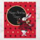 Étiquette de vin d'anniversaire festif avec illustration vintage du lapin blanc en robe de Reine des Coeurs teintée rouge avec cercle de texte personnalisable noir et or et arrière - plan de diamant rouge / or / noir