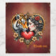 Le coeur du désert caché, un tigre majestueux et le profil d'une femme se mélangent astucieusement. Les deux motifs sont encastrés dans un cadre élégant en forme de coeur, soulignant l'humeur romantique. Le cadre est richement décoré de motifs floraux délicats qui se succèdent harmonieusement, lui conférant une touche ludique et imaginative. Au milieu des fleurs se trouve un coeur rouge vif, symbolisant l'amour et la passion.