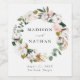Elégants étiquettes de vin mariage fleuris avec vos noms entourés d'une couronne fleurie de magnolias blanc aquarelle, roses roses rousses, fleurs de coton et feuilles verts. La date et la ville/l'état de votre mariage sont affichés ci-dessous. Design en coordonnées avec notre collection mariage Watercolor Magnolias.