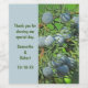 Dites "merci" à vos invités mariages avec un saké à emporter ou une bouteille de vin spécial pour la table de réception. Ces étiquettes de bouteilles de vin disposent d'une photo de baies de pins printaniers. Ces baies rondes sont d'une belle couleur gris bleu qui pousse en grappes le long des branches de pin vert. Les mots d'appréciation, les noms de la mariée et du marié et la date du mariage apparaissent contre un arrière - plan bleu correspondant et peuvent facilement être personnalisés.