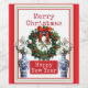 These festive Christmas and Happy New Year wine labels feature a Holly wreath with a red ribbon, and blue-and-white chinoiserie vases filled with flowers. The text is bold and stylized, perfect for your Christmas celebration.