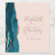 This modern wedding design features a teal blue watercolor agate and rose gold faux glitter border on the left edge. Personalize it with the couple's names in elegant rose-colored handwriting script over a large ampersand on a blush pink background, with the wedding date below.