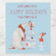 La scène de Noël est pleine de gros et de petits ours polaires décorant leur arbre. Illustration aquarelle sur un arrière - plan bleu clair avec le message "Joyeuses fêtes" dessiné à la main rouge