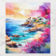 "Plage isolée". Une plage méditerranéenne isolée avec une mer bleue tranquille est encadrée par de jolies fleurs roses et violettes. Un endroit calme et décontracté pour la contemplation.