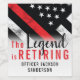 Cette conception comprend un drapeau de pompiers avec des rayures noires et blanches, ainsi qu'une fine bande rouge. Le texte "La légende prend sa retraite" se trouve au-dessus du nom du pompier, lieutenant ou chef qui prend sa retraite. Fêtez dans le style !