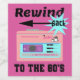 Rewind Back to the 80's, ce design présente un style rétro des années 1980 en rose et bleu avec un texte disant, "Rewind Back to the 80's".