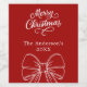 Arrière - plan rouge, texte blanc et arc Célébrez la saison avec nos étiquettes de vin rouge Joyeux Noël moderne. Personnalisez et ajoutez votre nom.